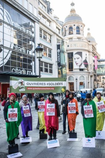 La campagne "#Soldées, Qui est la moins chère ?" a été lancée en 2014 pour soutenir les travailleur-euse-s de l’industrie textile qui se mobilisent pour obtenir un salaire vital qui leur permette de vivre dignement.